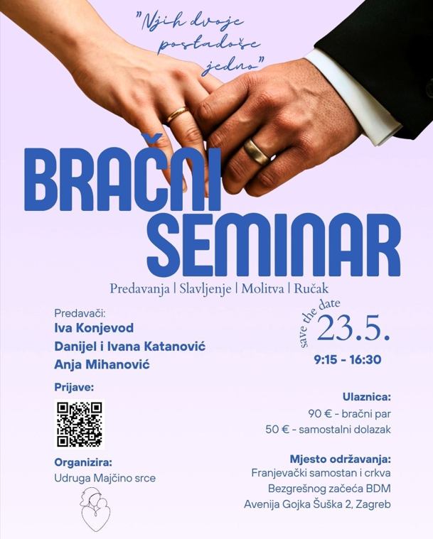 Pozivamo vas na Bračni seminar u organizaciji naše Udruge Majčino srce, koji će se održati 23. svibnja 2026. s početkom u 09:15 sati u Franjevačkom samostanu i crkvi Bezgrešnog začeća BDM (Avenija Gojka Šuška 2, Zagreb).